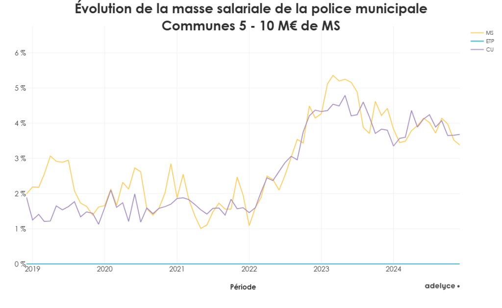 • 2022-2023 : forte accélération (+5 % à +6 % par an) causée par la revalorisation du point d’indice (inflation) et des dispositifs spécifiques mis en place pour attirer dans la filière sécurité. Les recrutements ont repris (+1 % d’effectifs) à un rythme équivalent à ceux dans toute la fonction publique territoriale.