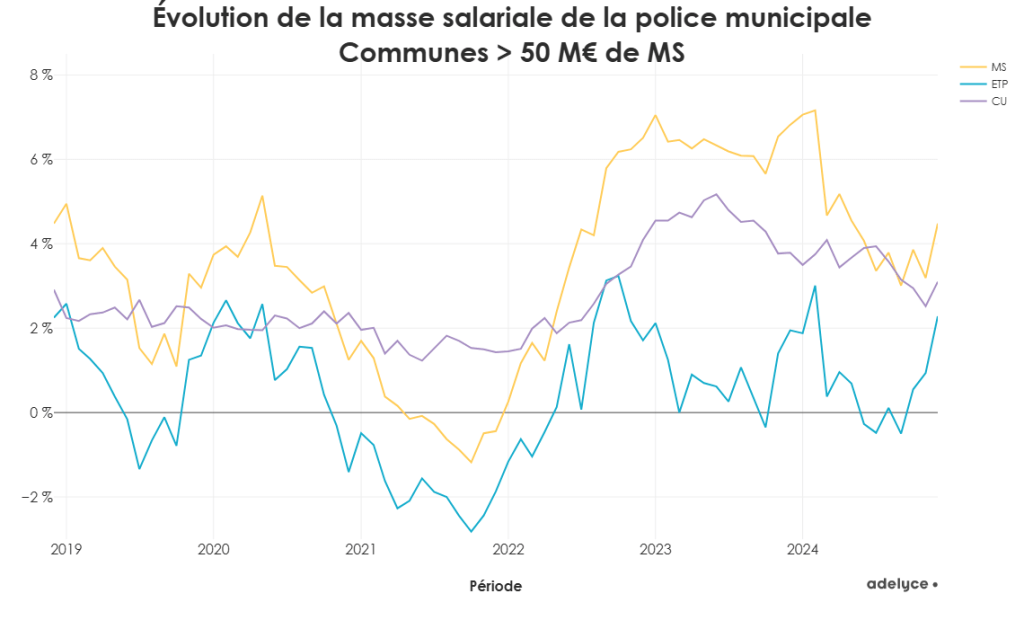 Les communes moyennes, de 20 à 50 millions d’euros de masse salariale, affichent une hausse de +20 %, portée par des polices municipales mutualisées et actives.