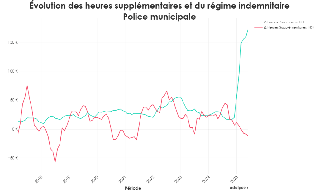 L’analyse qui succède observe l’impact de la revalorisation du régime indemnitaire sur le volume des heures supplémentaires. Le graphique, en variations mensuelles, montre une forte hausse du régime indemnitaire à partir de janvier 2025, tandis que les heures supplémentaires tendent à diminuer.