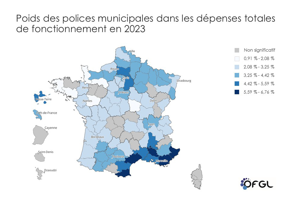 L’étude 2024 de l’OFGL met également en évidence des disparités géographiques dans les dépenses de polices municipales, notamment en Île-de-France et dans l’arc méditerranéen, où elles pèsent davantage dans les budgets.