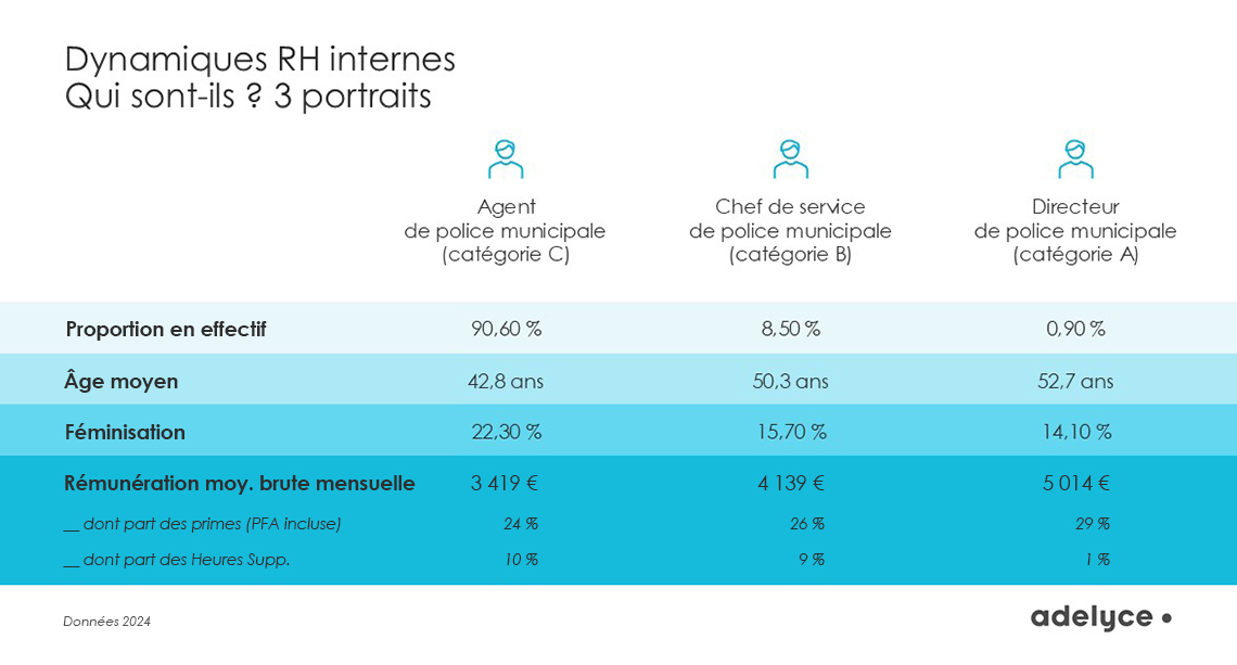 Les données suivantes proviennent de l’Observatoire Adelyce et sont issues d’un panel de plusieurs centaines de collectivités locales. Elles se concentrent sur les agents de la police municipale (y compris chefs de service et directeurs), représentant environ 7 800 agents, majoritairement à temps plein, soit près de 30 % des effectifs nationaux.
