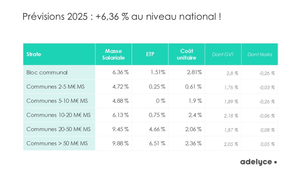 En 2025, la masse salariale des collectivités locales devrait augmenter d’environ 6,4 % à l’échelle nationale. Cette évolution est principalement due à l’augmentation du coût unitaire, notamment liée à la mise en place du nouveau régime indemnitaire ISFE. S’y ajoutent le glissement vieillesse-technicité (GVT), les avancements, les promotions et la revalorisation des cotisations CNRACL (environ 2 points de hausse à elle seule).