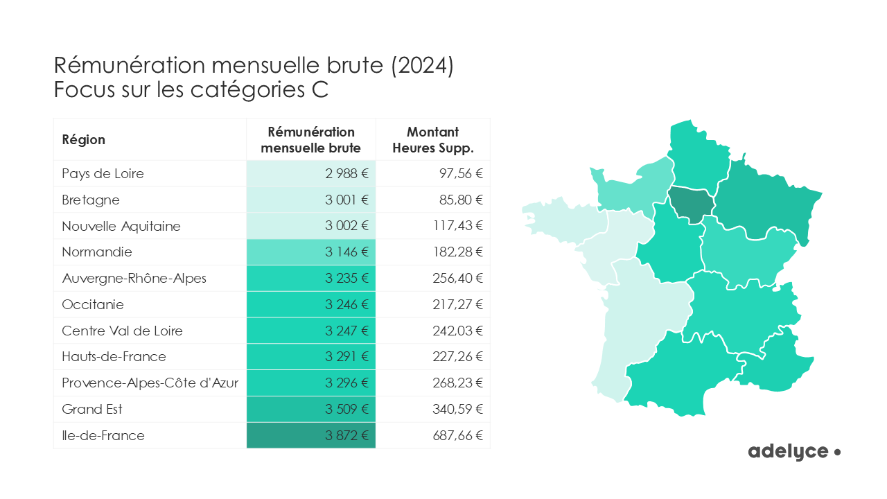 • Rémunération moyenne : 3 419 euros bruts par mois (dont 24 % de primes, 10 % d’heures supplémentaires)