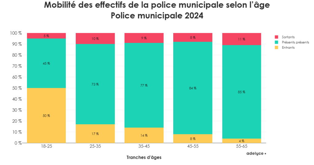 La mobilité des agents de police municipale constitue un enjeu majeur car elle influence la stabilité des équipes et la continuité du service public. Les données de l’Observatoire Adelyce montrent que la mobilité est surtout marquée chez les jeunes :